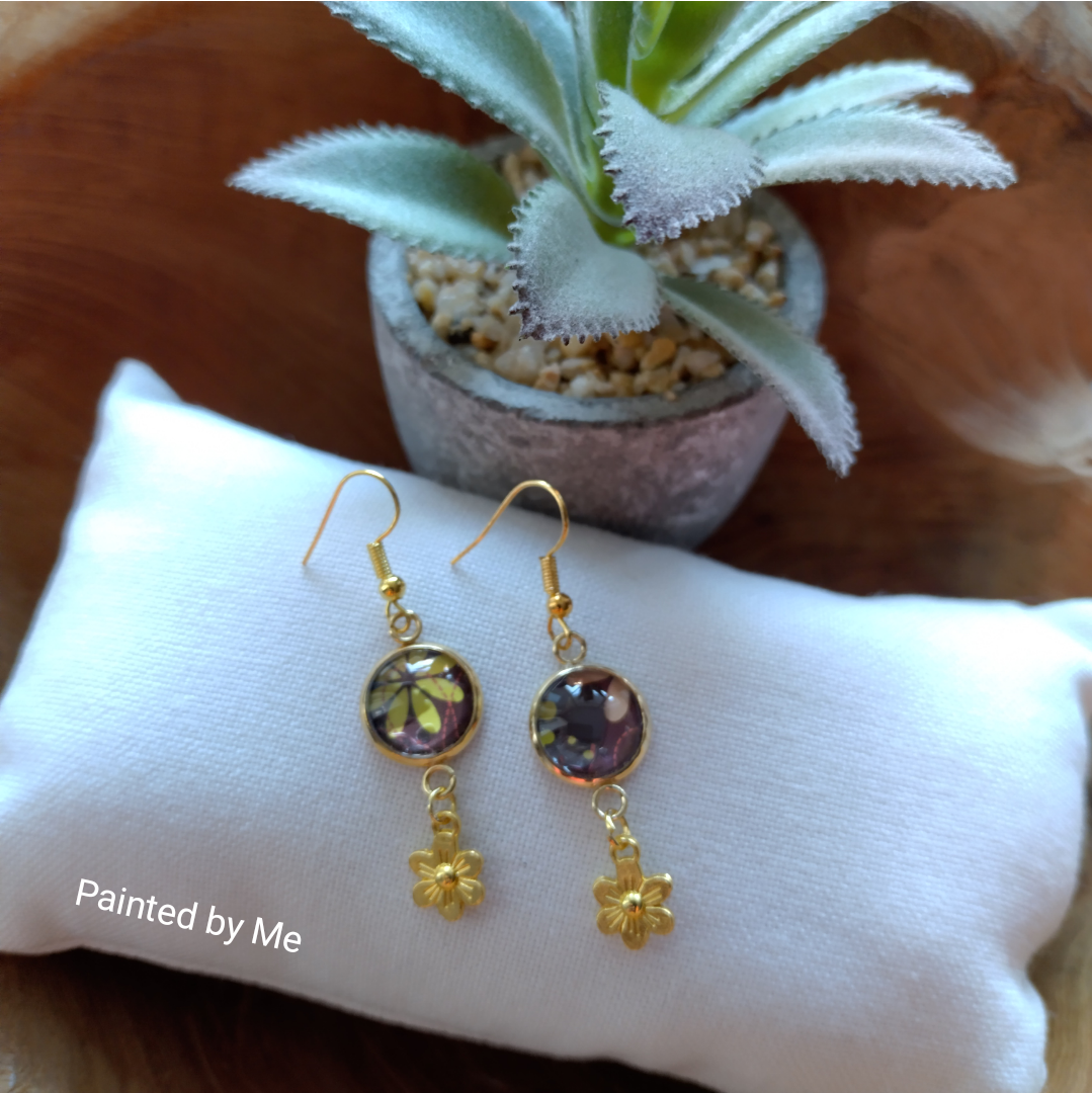 doorsnee cabochon 12 mm. Lengte oorbel inclusief goudkleurig bloemetje bedeltje: 35 mm.