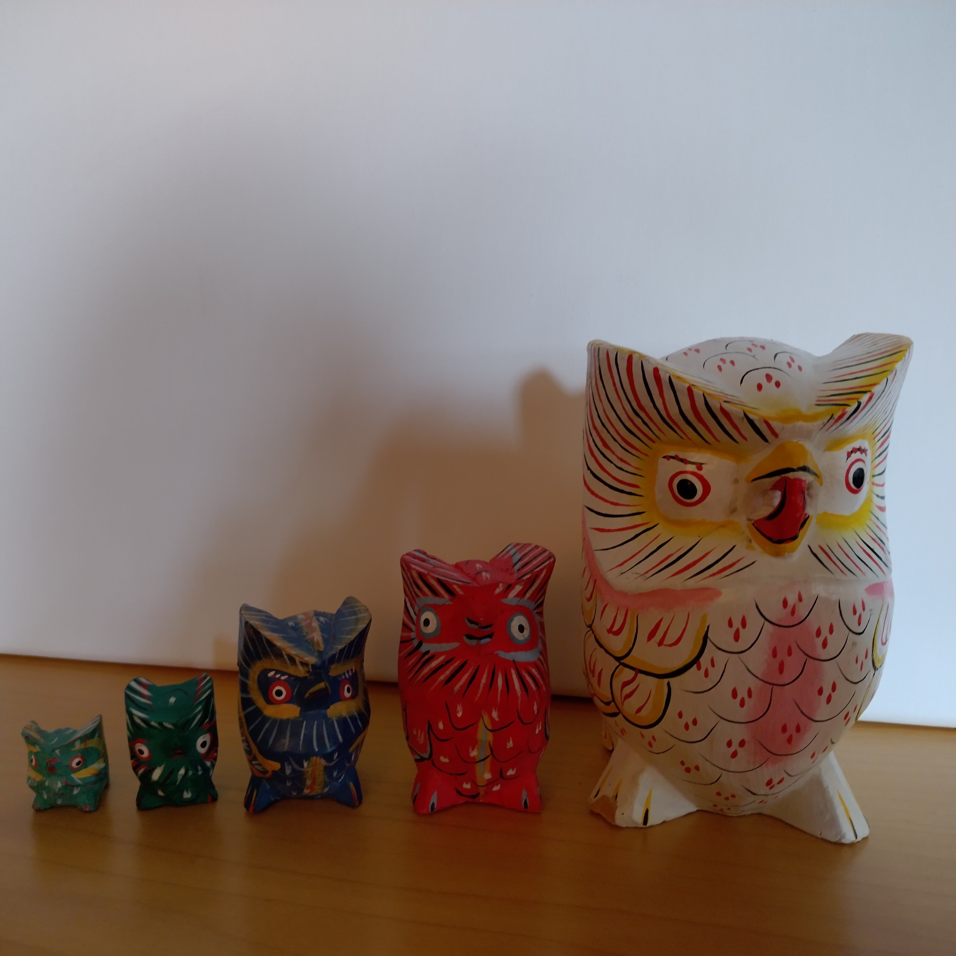 Bijzonder groen mini houten beeldje van een uiltje voor de ware verzamelaar of liefhebber. Kleinere uitvoering van het blauwe en rode beeldje (zie laatste foto's).